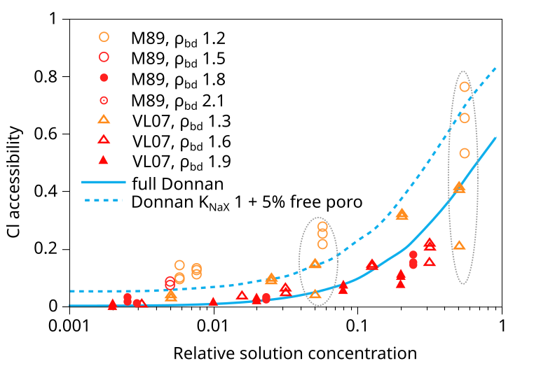 Unfortunately, several studies have used or reported the Vl07 data (as well as other data we have assessed) without sufficient rigor when evaluating salt exclusion in compacted bentonite. As a relatively recent example of this, Gimmi and Alt-Epping (2018) compare two models for chloride exclusion with empirical data in a figure that looks very similar to this6