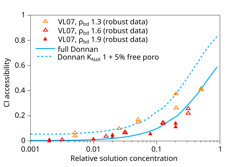 In addition to the VL07 data, this plot also compare with data from Mu886 — a study that we have discarded. Taking the above plot at face value it is hard not to wonder what use the experimental data really has — the spread at certain places is almost an order of magnitude (indicated in the figure). You can basically fit any favorite model to this data (or rather, you can fit no model to this data). Gimmi and Alt-Epping (2018) anyway compare the data with two Donnan equilibrium models. One (“full Donnan”) is essentially equivalent to the homogeneous mixture model (all pore space is treated equally), while the other includes several specific additional model components (“free” porosity, exchange “sites”). Gimmi and Alt-Epping (2018) use this plot to argue for that these particular additional components become significant for bentonite at the lower density. But if we “clean up” the plot and only use data points that has passed the present assessment, the picture is instead this