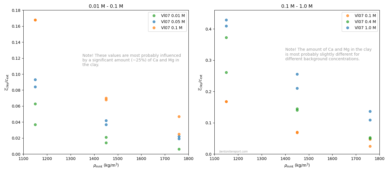 These values have been evaluated from the “Cl-accessible porosities” reported in table 6 in Vl07.8 The exact values of equilibrium concentration ratios and effective montmorillonite densities depend on adopted values for grain density and montmorillonite content. Here we have adopted \(\rho_s\) = 2800 kg/m3 and 80% montmorillonite. Note that equilibrium concentrations and densities are burdened with additional uncertainties that are not indicated in the above diagram. Note also that although most conditions in the above plot have two data points, these correspond to a single sample. For more details we refer to the individual assessment.