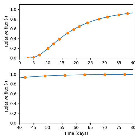 This would give sampling at 20 occasions over about 80 days that ideally corresponds to four times the breakthrough time, like this